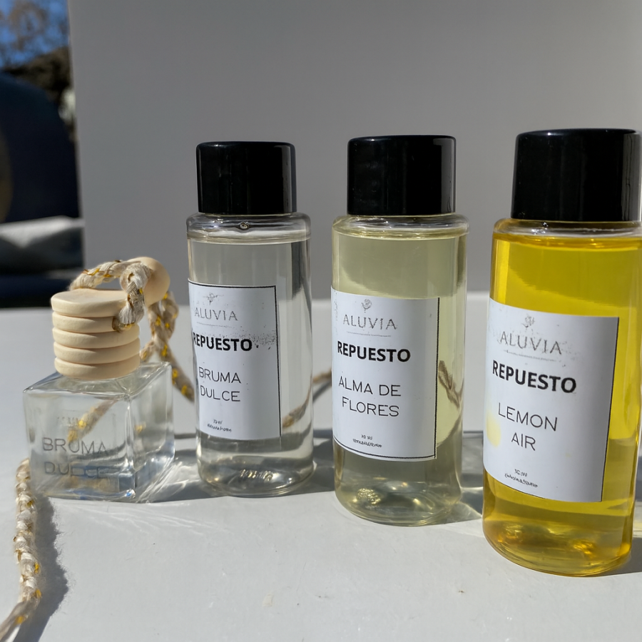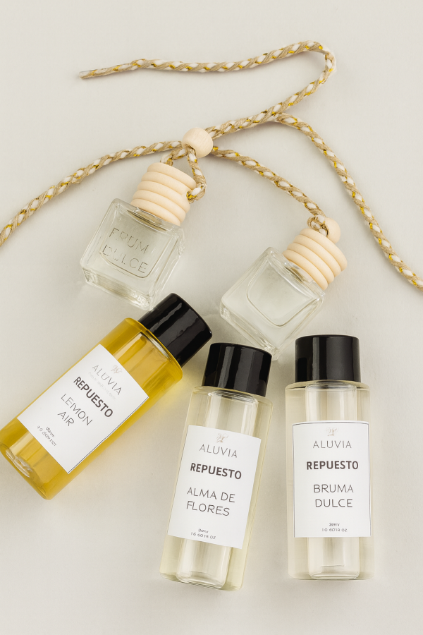 Refil de 30 ml especialmente diseñado para recargar tu perfumador colgante Aluvia hasta 3 veces. Su fórmula concentrada mantiene la intensidad del aroma durante semanas, perfumando de forma constante y agradable el interior de tu auto, placard o cualquier espacio reducido.