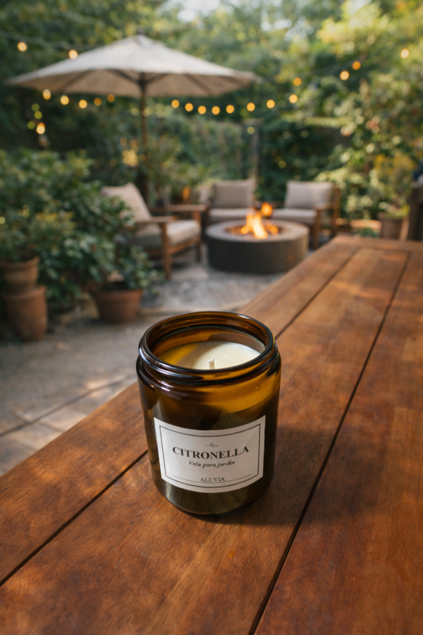 Vela de citronella ideal para patios, balcones, terrazas y jardines. Su aroma fresco y natural ayuda a mantener alejados los insectos mientras perfuma suavemente el ambiente.