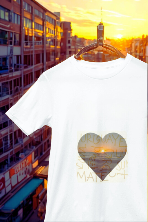 El diseño presenta el mar en un atardecer cálido y luminoso, enmarcado por una delicada forma de corazón. Rodeando la escena, una sopa de letras revela palabras que nos definen: Uruguay, mate.