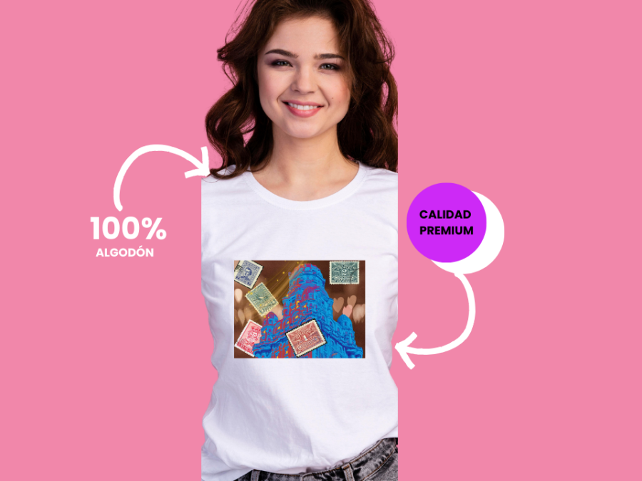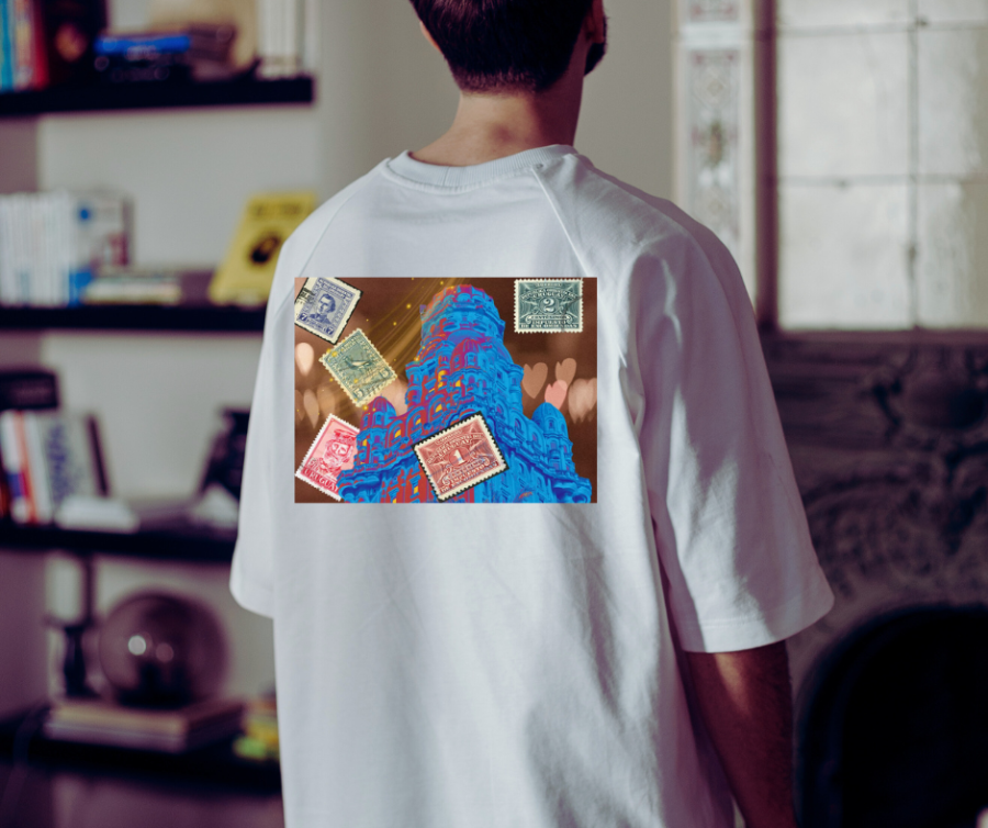 La composición une arquitectura, historia y emoción en una imagen dinámica y poética. Los sellos en movimiento aportan ligereza y narrativa, como fragmentos de historias que siguen vivas.