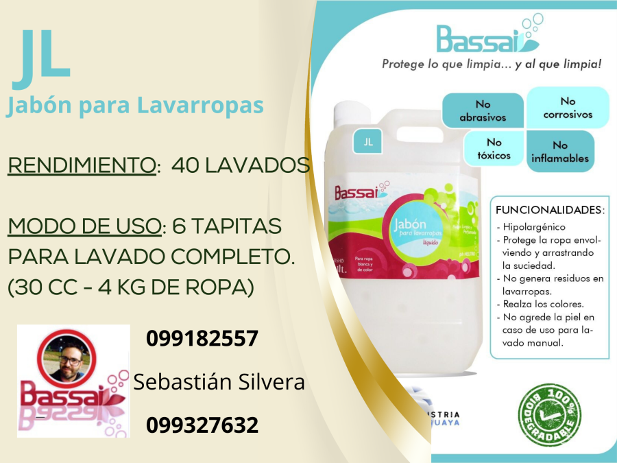 JL es un producto diseñado para el lavado de todo tipo de prendas incluso las más finas que limpia sin agredir, envolviendo y arrastrando la suciedad, no contiene partículas sólidas ni componentes que afecten los colores por lo contrario realza los mismos especialmente el blanco. Probado en test de sedimentación, dando como resultado 0%, por lo tanto no obstruye los depósitos ni los caños de su máquina. Su pH neutro no agrede sus manos (en caso de lavado a mano),ni prendas, ni lavarropas. Usos y Diluciones Coloque 25 cc en la gaveta del lavarropas cada 4 kgs. de ropa. Contiene: Tensoactivos no iónicos y aniónicos, blanqueador óptico, colorantes autorizados, perfume.