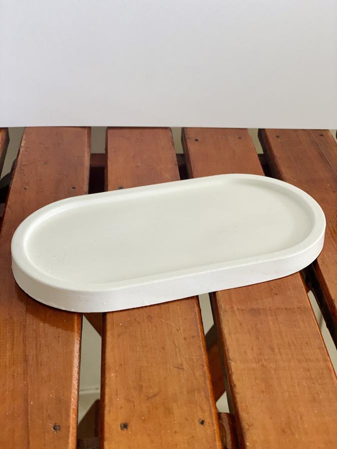 Bandeja ovalada minimalista. Pieza moderna e irrepetible, ideal como base elegante para tus sets de velas o articulos personales. Material: Mezcla de yeso y cemento de alta resistencia. Medidas: 18 x 9 x 1 cm. Sellada y barnizada
