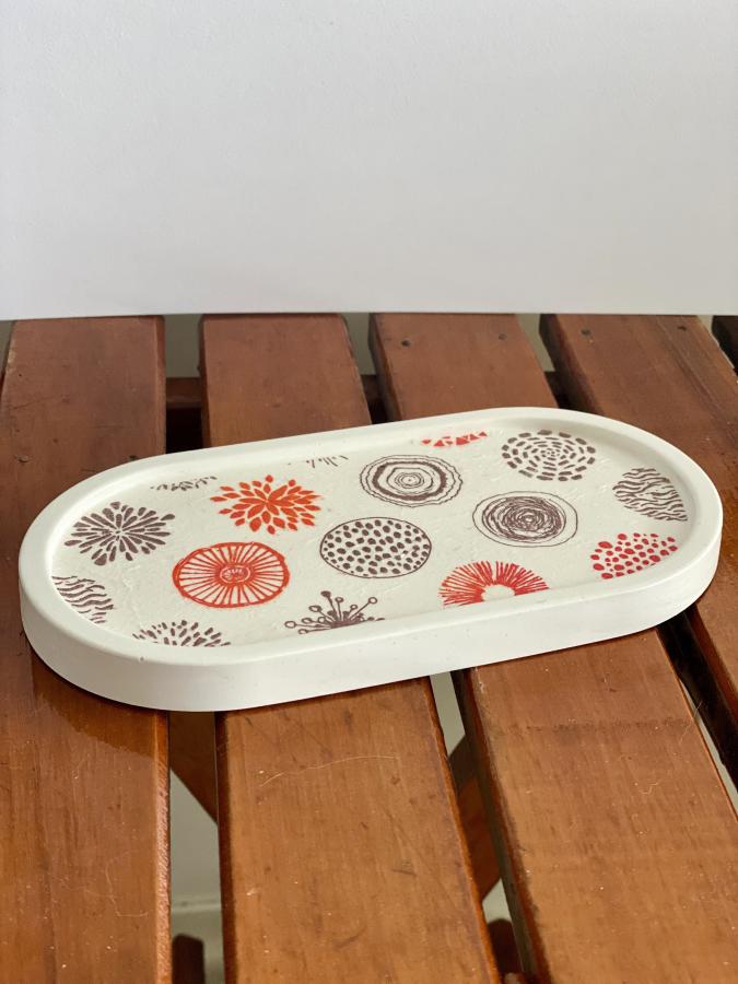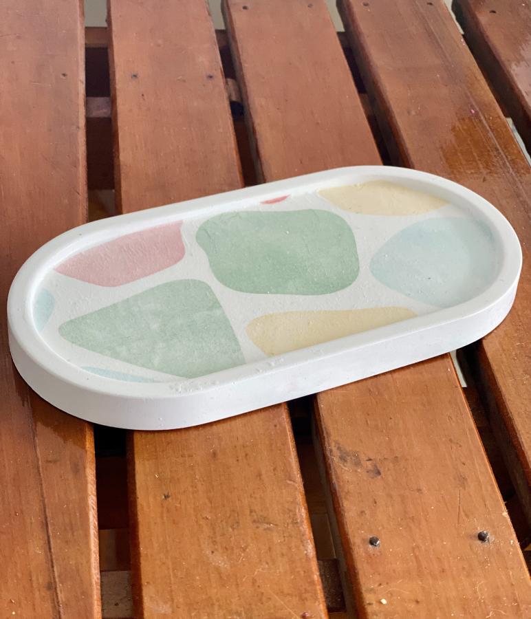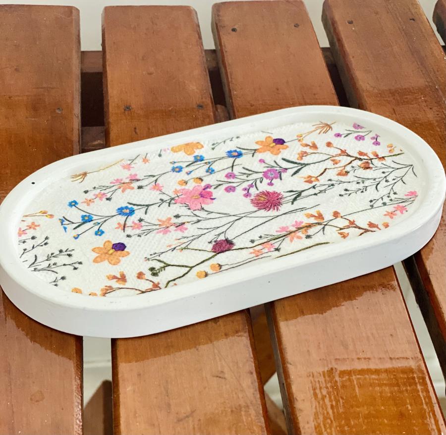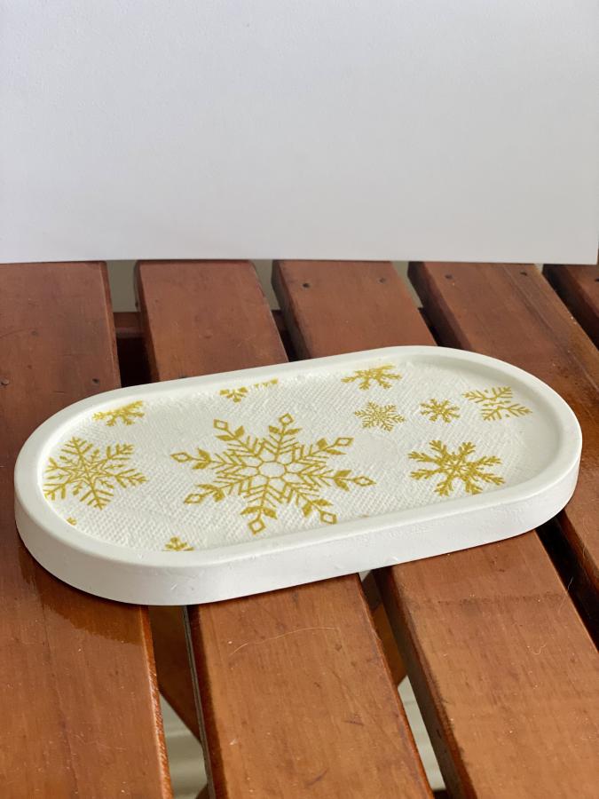 Bandeja ovalada con decoupage. Pieza de arte única, combina yeso macizo y decoración en decoupage. Con diferentes diseños elegantes. Sellado protector. Material: Yeso y cemento. Medidas: 18 x 9 x 1 cm.Sellada y barnizada