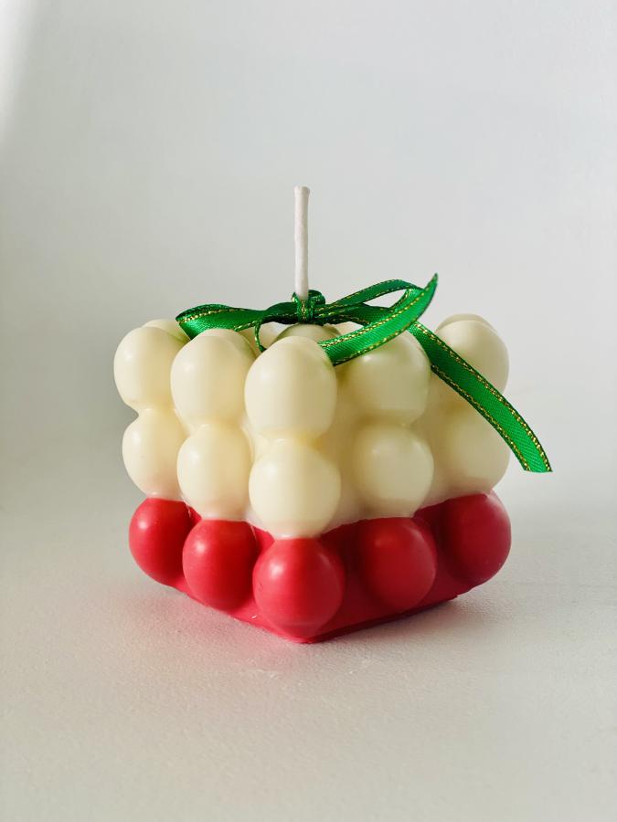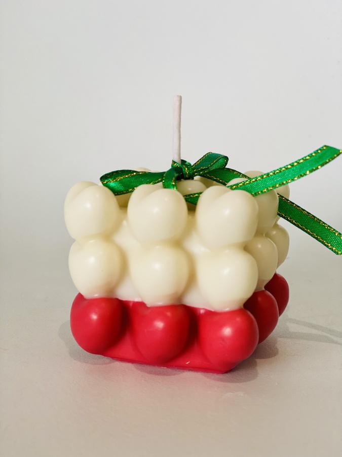 Vela Corazón Bubble. Diseño de burbujas moderno y festivo. Delicado y perfecto para regalar. Una pieza que combina lo tierno con lo decorativo. Material: Cera de soja. Medidas: 6.5 cm x 6.5 cm x 6.5 cm.