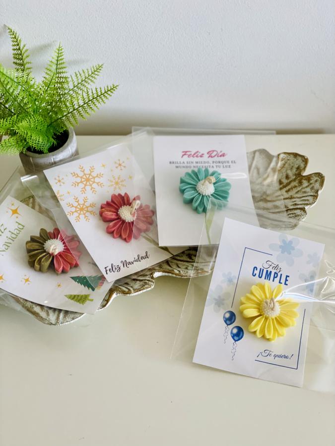 Incluye 1 Tarjeta Margarita. Detalle artesanal único que combina la delicadeza floral con el espíritu de cualquier celebración que tú tengas, añadiendo un recuerdo elegante. Material: Cera de soya y tarjeta de papel. Medidas: 10 cm x 15 cm