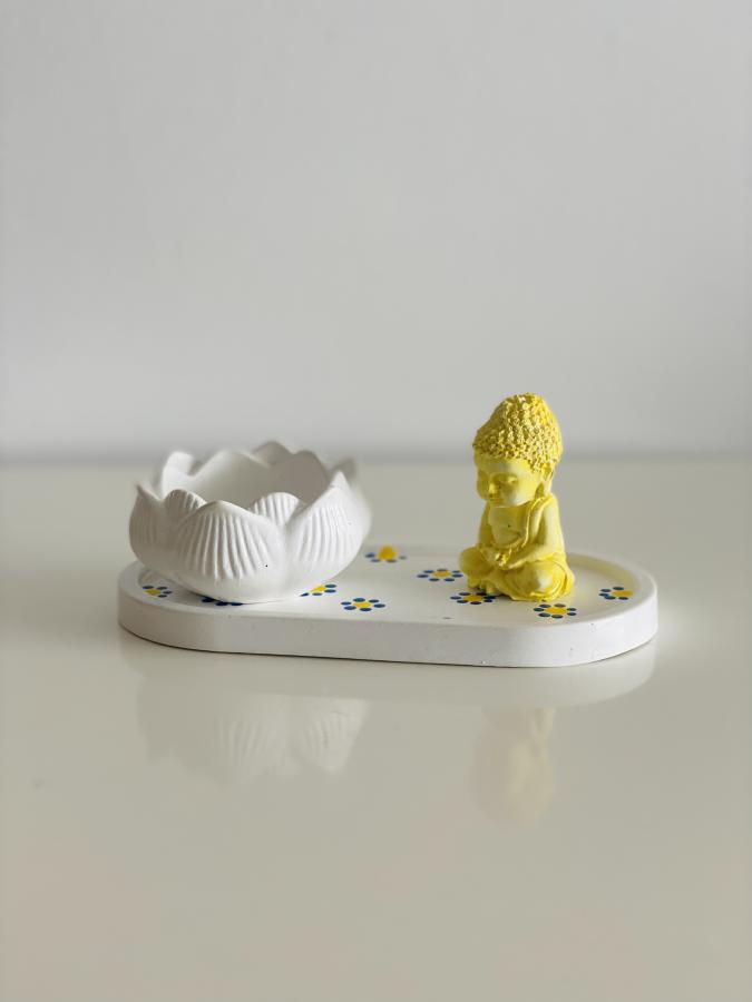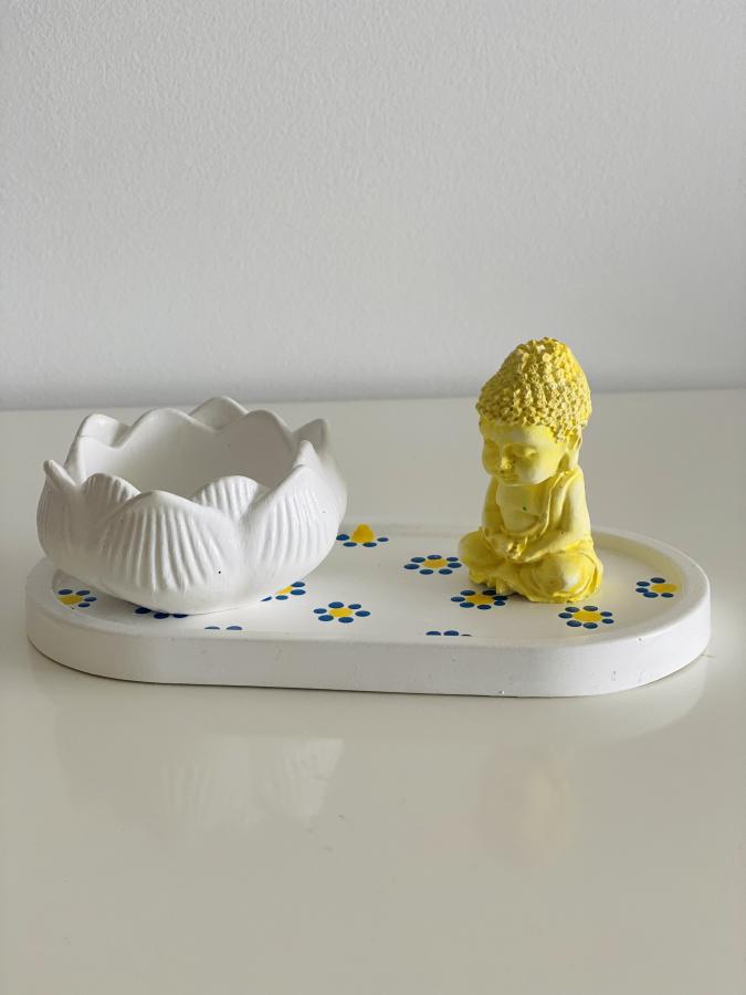 Bandeja ovalada, Flor de Loto sin vela y Buda de yeso. Trío ideal para crear un espacio de paz y enfoque. Material: Yeso y Cemento. Medidas: Bandeja 18 cm.