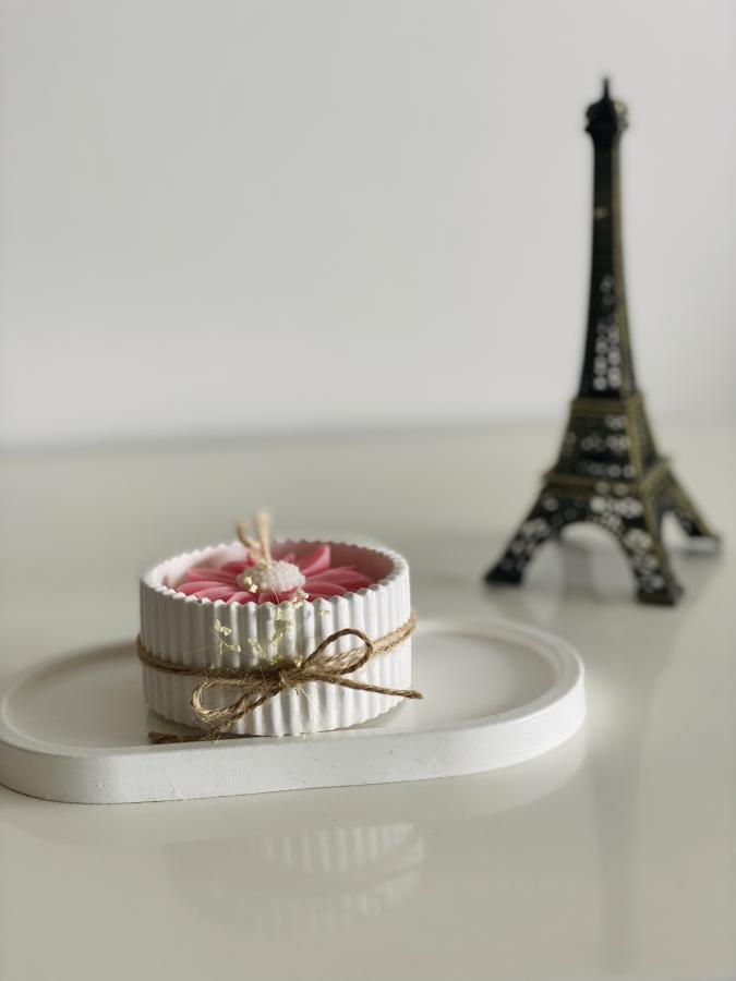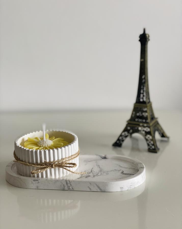 Bandeja ovalada, base Circus con vela Margarita. El contraste perfecto entre lo rústico y lo floral. Material: Yeso/Cemento y Cera de soja. Medidas: Bandeja 18 cm.