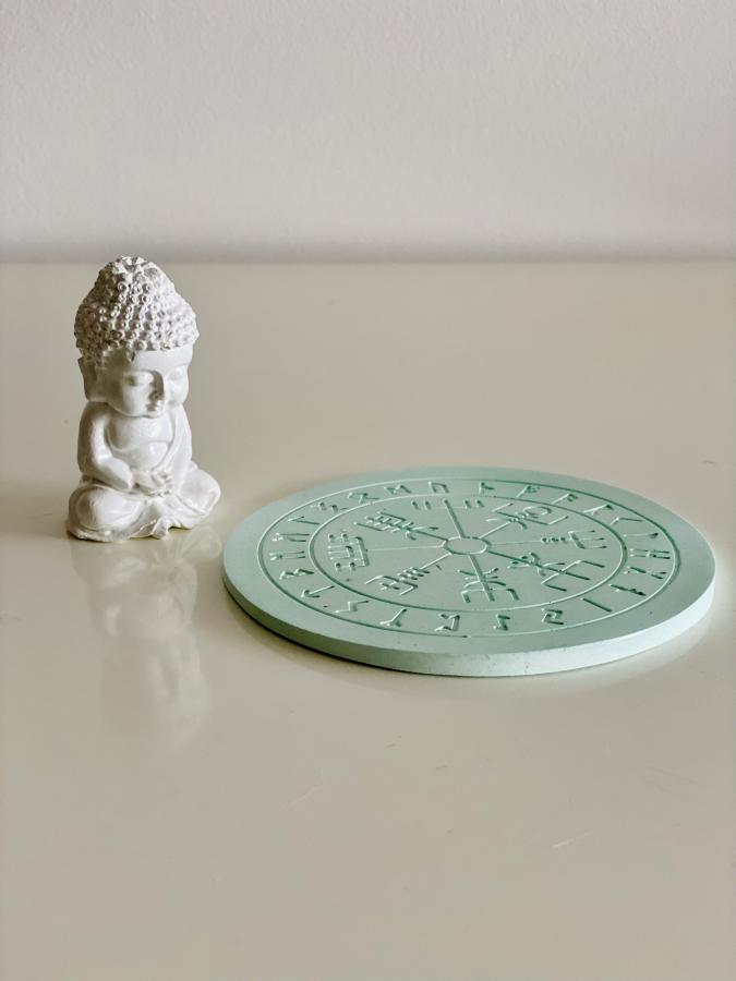 Bandeja circular con simbología nórdica y Buda de yeso. Ideal para quienes valoran la decoración con significado. Material: Yeso y Cemento. Medidas: Bandeja 18 cm.