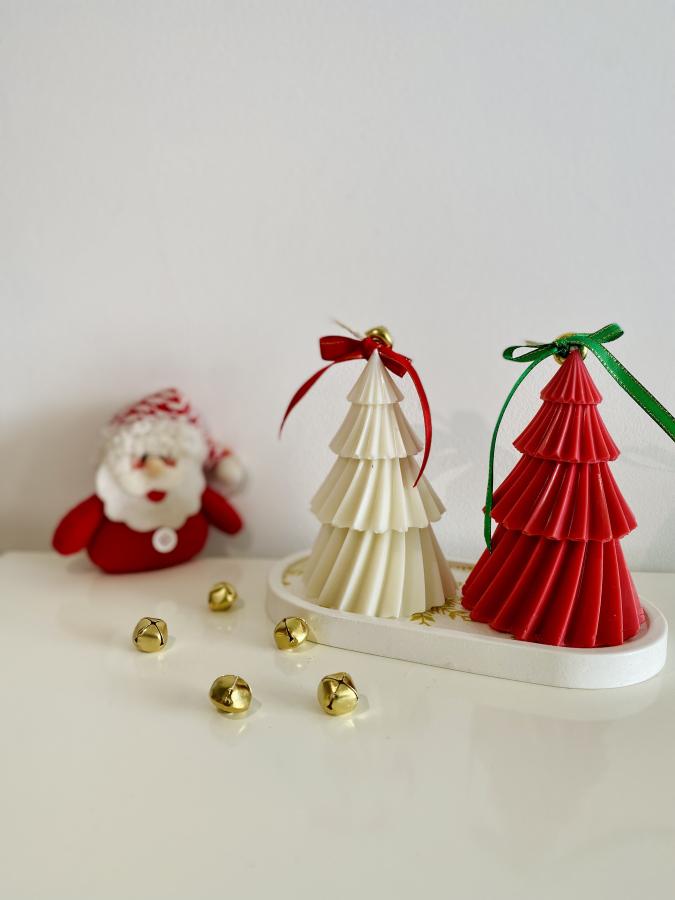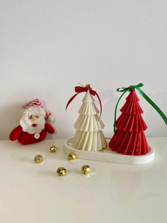 Bandeja ovalada y 2 velas Árbol de Navidad. Elegancia simple para la decoración de fiestas. Material: Yeso y Cera de soja. Medidas: Bandeja 18 cm.