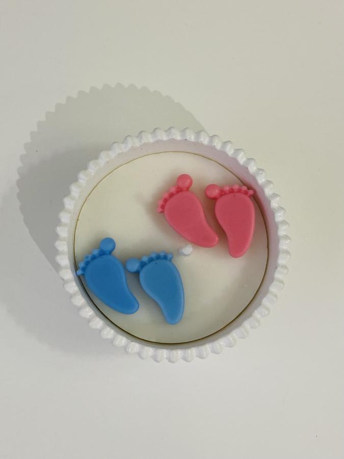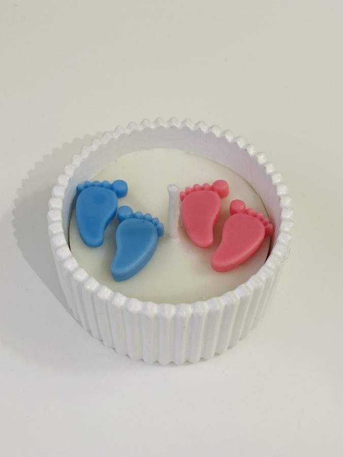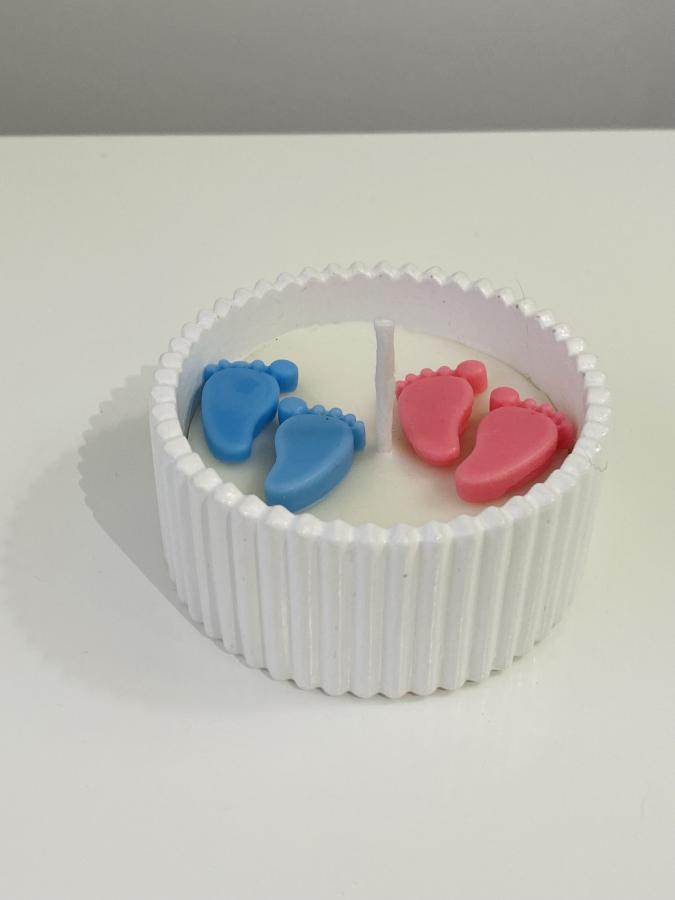 Base artesanal con vela de soja decorada con patitas en azul y rosado. Medidas: Base 10 cm x Alto 5cm. Material: Yeso/Cemento y cera de soja. La forma más dulce y original de compartir una gran noticia. ✨👣