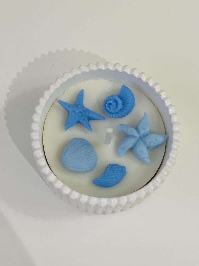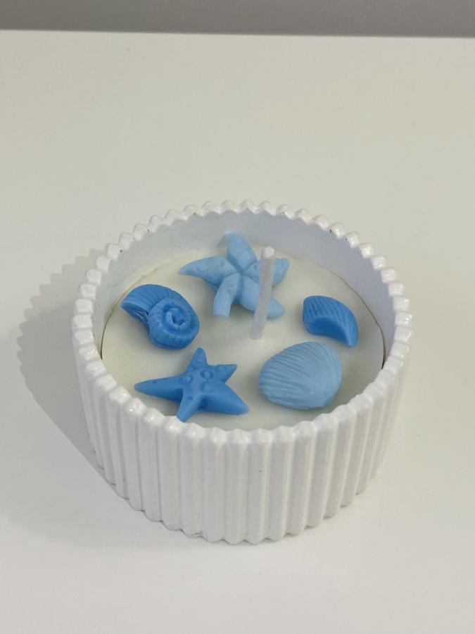 Sentí la brisa marina con esta vela decorada con caracoles y estrellas de mar. Medidas: Base 10 cm x Alto 5cm. Material: Yeso/Cemento y cera de soja. Ideal para decorar ambientes frescos 🐚🌊