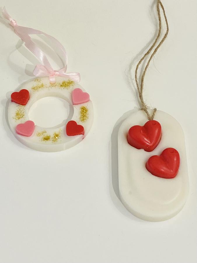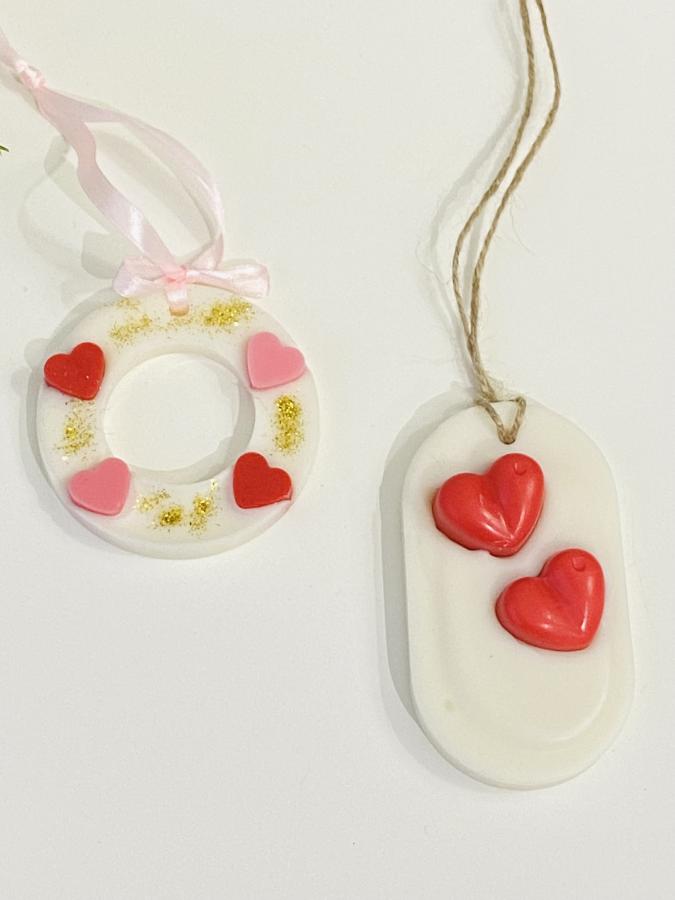 Edición especial San Valentín con delicados corazones en relieve. Medidas: 9.5 cm alto x 5cm ancho x 1cm grosor. Argolla: 7cm diametro.Material: 100% cera de soja artesanal. El detalle perfecto para regalar o aromatizar con mucho amor ❤️💌