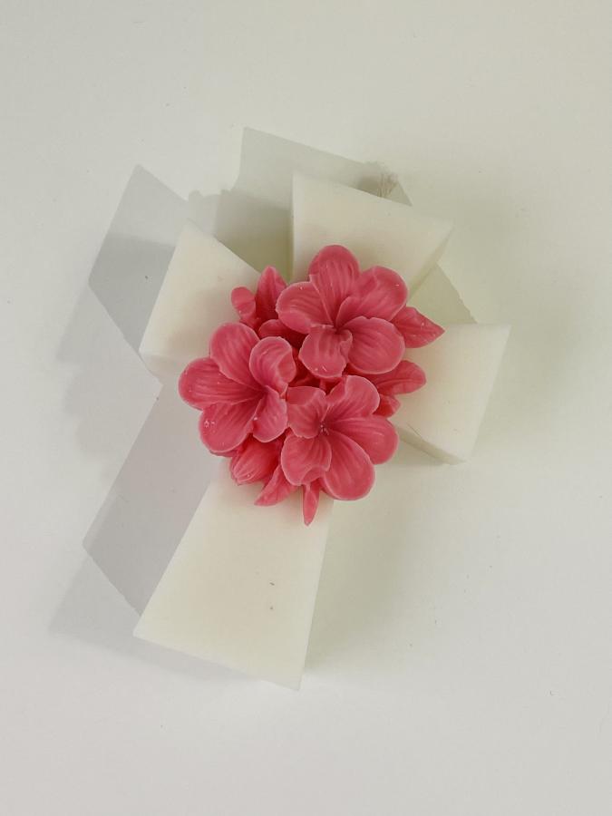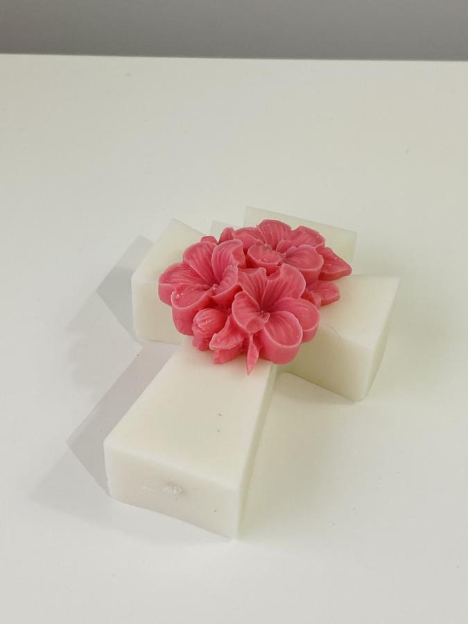 Una combinación llena de paz y delicadeza. Incluye cruz artesanal y flor de hortensia en cera de soja. Medidas: 10cm alto x 7 cm ancho x 2cm Profundidad. Un regalo con significado y un diseño botánico único ✝️🌸