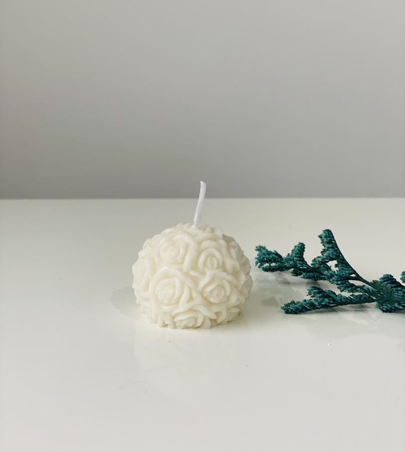 Delicada esfera cubierta de pequeñas rosas en relieve. Medidas: Diámetro 4cm x 3cm alto. Material: 100% cera de soja artesanal. Un detalle romántico y compacto, perfecto para decorar mesitas de luz o repisas. 🌹✨