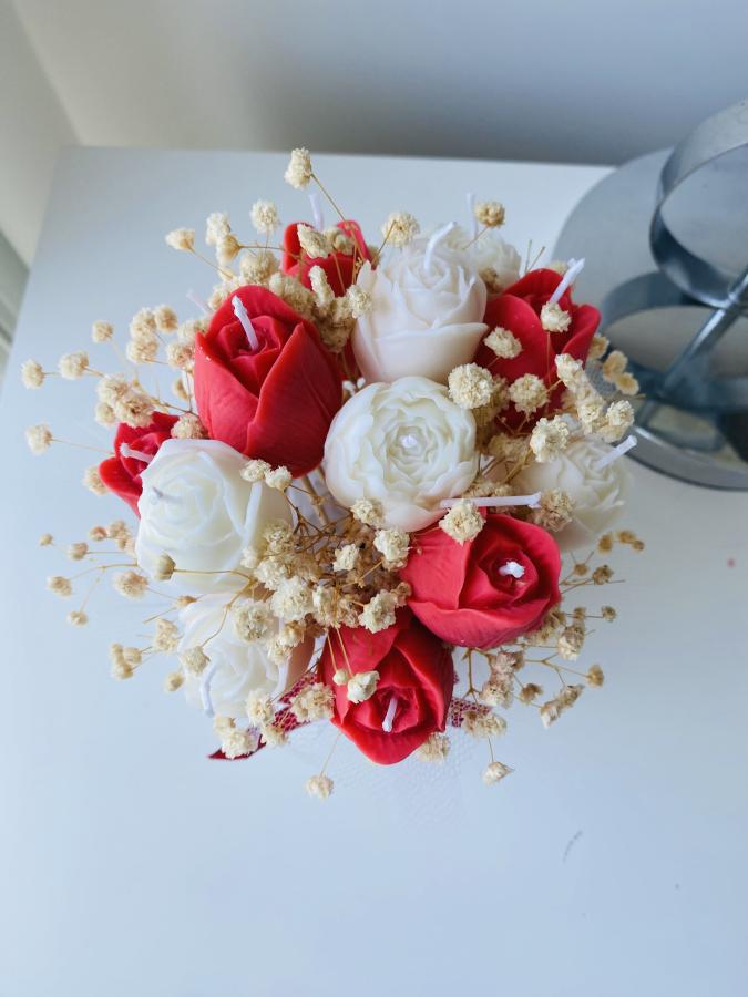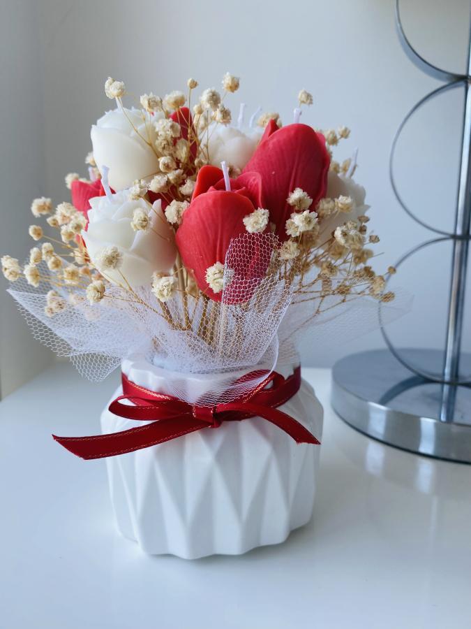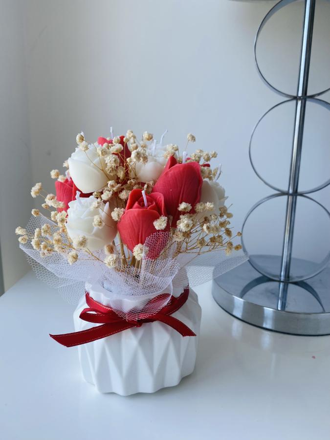 Impactante ramillete de velas florales en maceta de yeso y cemento artesanal. Incluye rosas y tulipanes de cera de soja. Un jardín eterno que decora y aromatiza con máxima elegancia. 🌸🏠 Incluye 6 velas tulipanes y 7 velas de rosas.