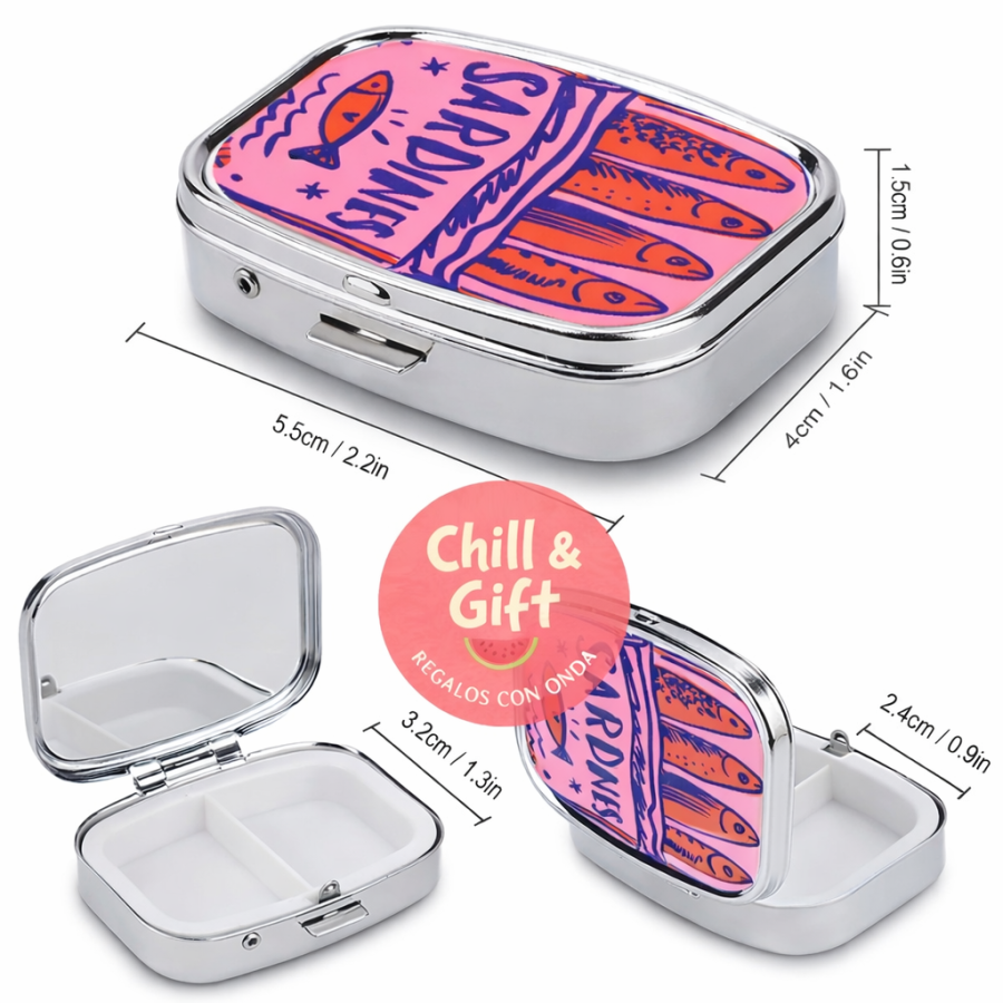 Pastillero portátil con un diseño creativo inspirado en una clásica lata de sardinas, en tonos rosa y naranja que le aportan un estilo moderno, divertido y original.