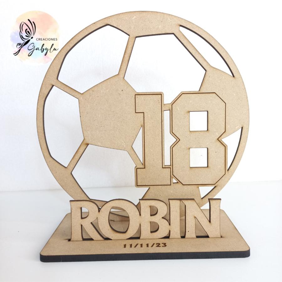 Centro de mesa para cumpleaños en mdf, pelota de fútbol, número y nombre, 22 cm de alto.