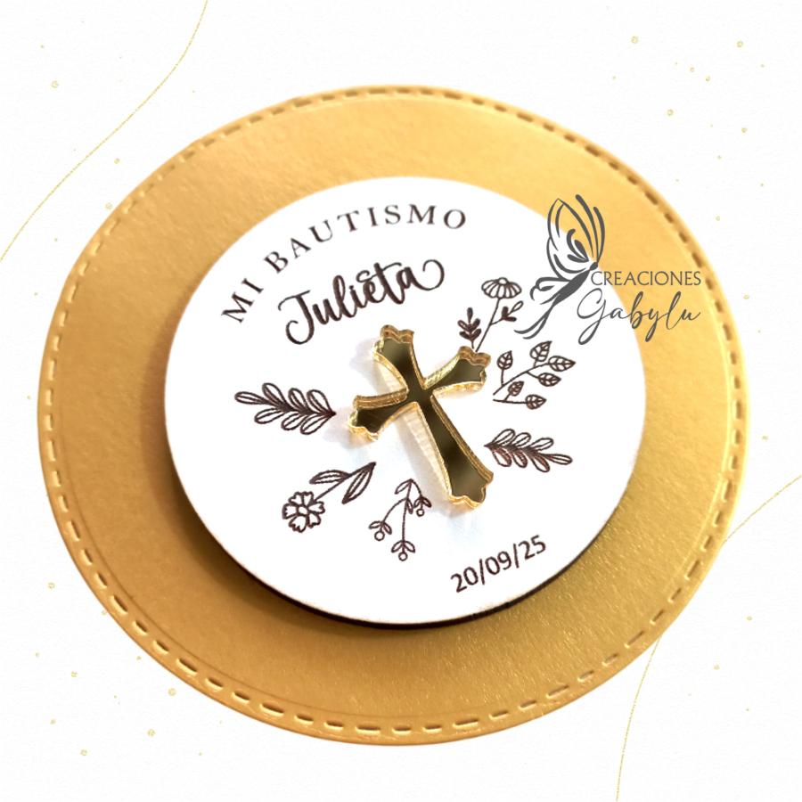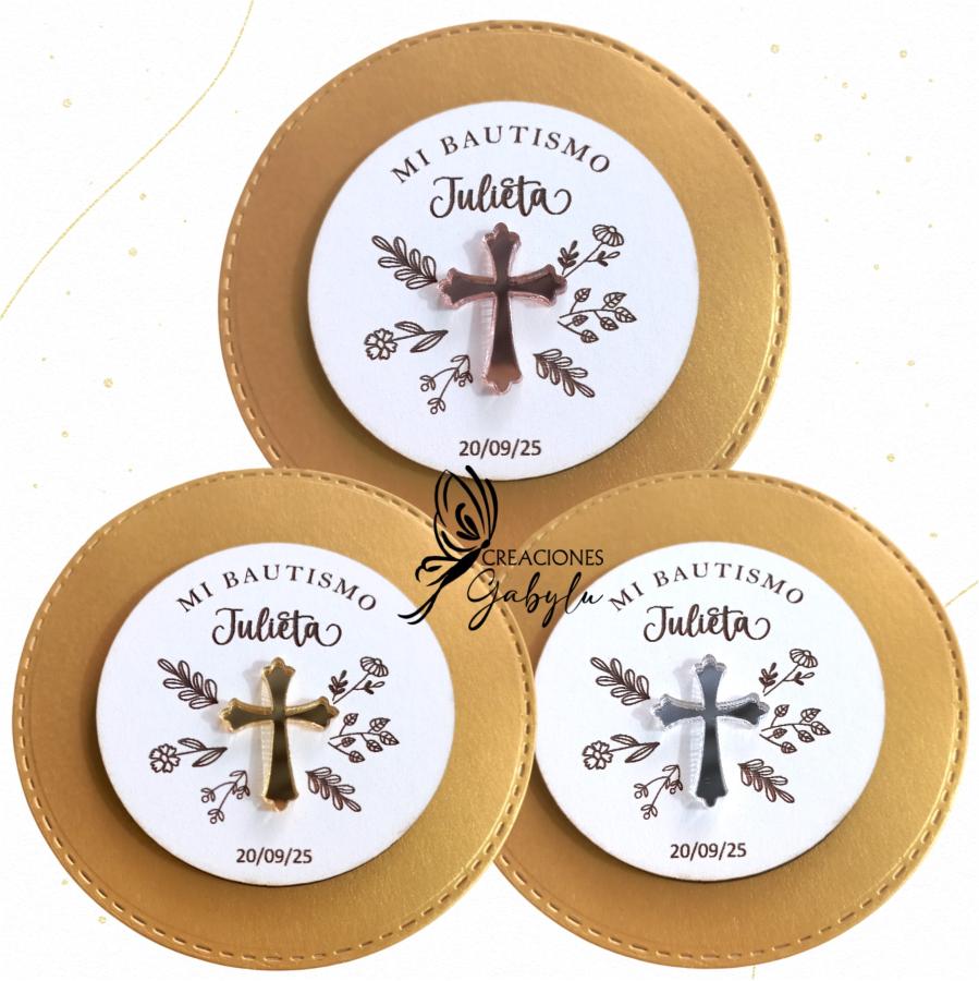 El aplique en forma de cruz está realizado en acrílico espejo 3 mm, disponible en dorado, plateado o rose gold.