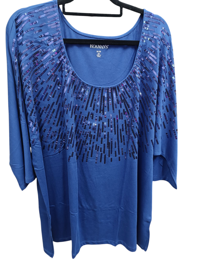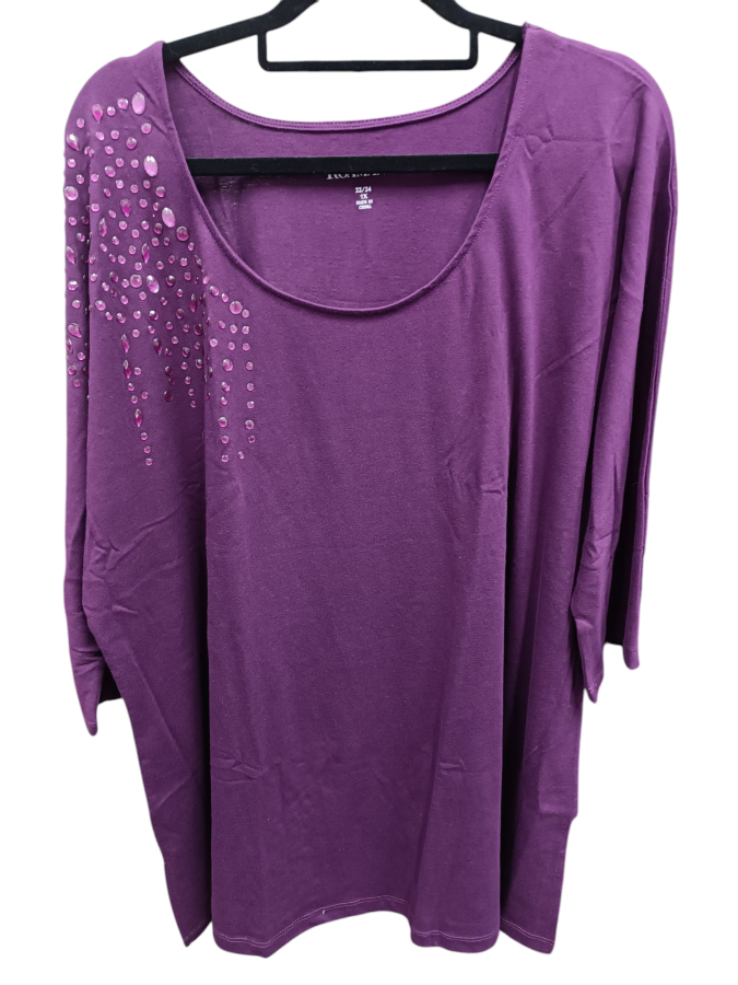 Remera plus size, azul con lentejuelas y violeta con piedras, ambas en talle 2XL.