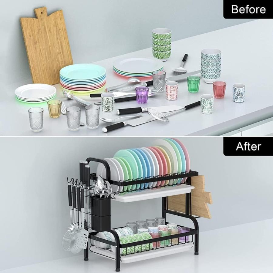 El escurridor de platos ofrece un amplio espacio de almacenamiento con dos niveles, permitiendo secar tanto platos como tazas, cubiertos y más. Su diseño multifuncional también incluye ganchos laterales para colgar utensilios de cocina, haciendo que sea un accesorio esencial en cualquier hogar. Con bandejas de goteo removibles, el agua se recoge fácilmente, evitando charcos en la mesada.