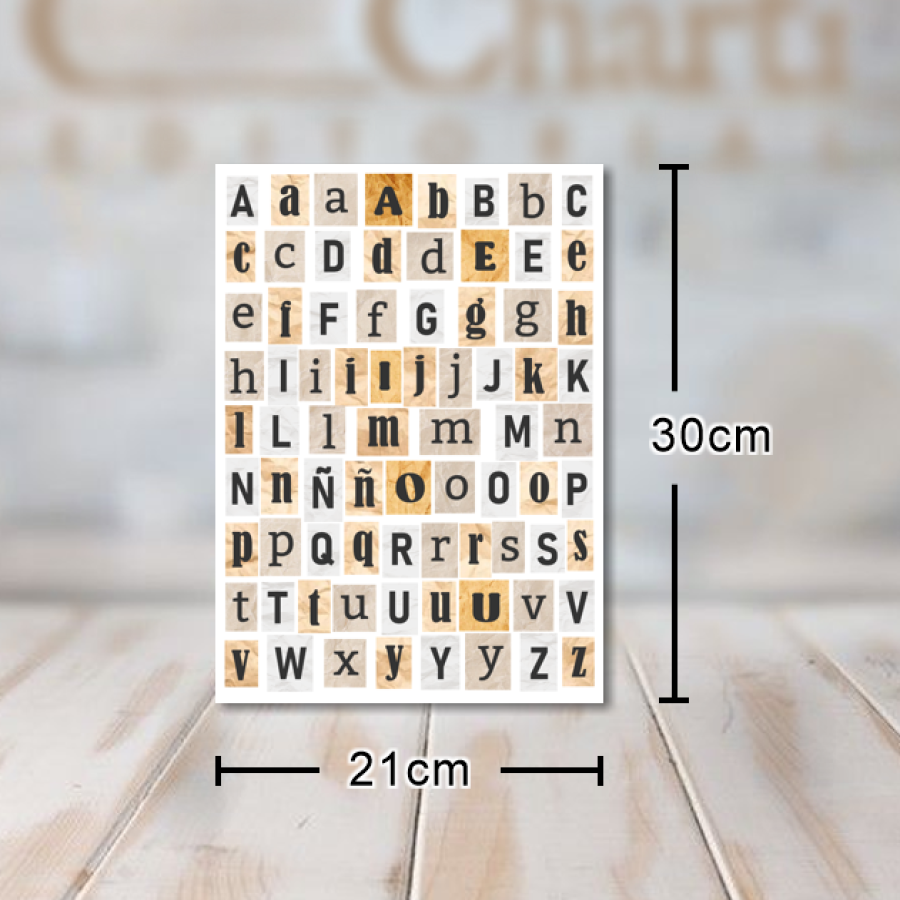 Set de 3 planchas de stickers recortables con llamativas letras que simulan tipografías de diarios y revistas. Cada plancha autoadhesiva mide 21x30cm.