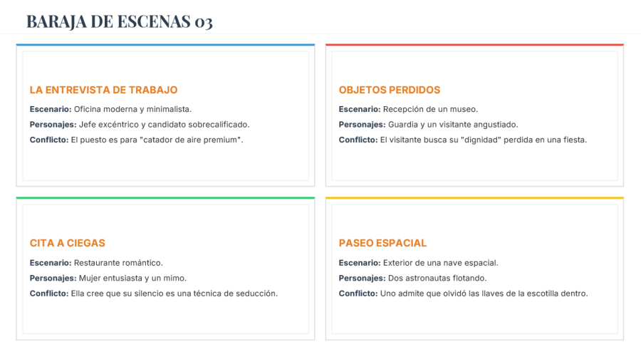 • Cómo usarlo: Un representante de cada grupo elige una carta al azar. Tienen 2 minutos para organizar una escena breve. También se pueden usar como consigna de escritura dramática: "Escriban el guion de una escena basada en esta situación".