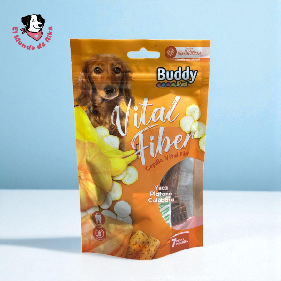 Snack dental con forma de cepillo, elaborado con una mezcla de frutas, verduras e ingredientes vegetales, sin granos y con celulosa en polvo que aporta fibra dietética. Ayuda a limpiar los dientes y cuidar la salud digestiva de tu perro mientras disfruta de un premio sabroso.