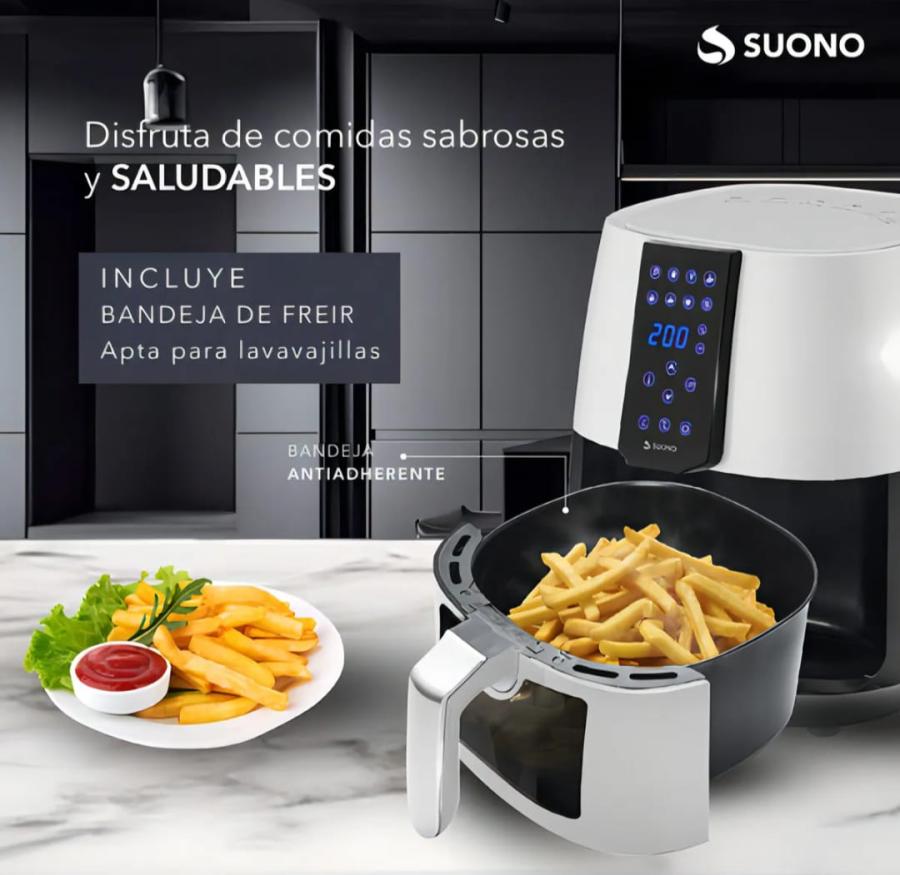 La Freidora de Aire Digital SUONO es ideal para preparar comidas ricas y saludables, usando poco o nada de aceite, sin perder sabor ni textura.