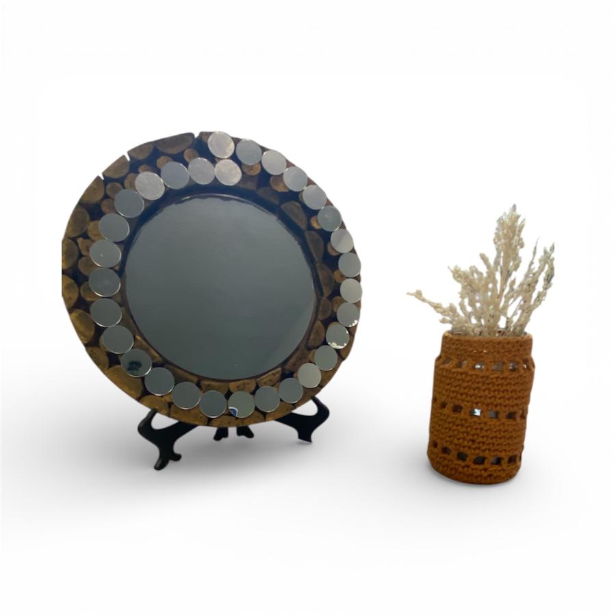 Espejo decorativo que combina un centro espejado con un marco de piezas geométricas estilo mosaico, creando un efecto luminoso y moderno con un toque artesanal. Perfecto para entrada, living o dormitorio, tanto solo como en composición.