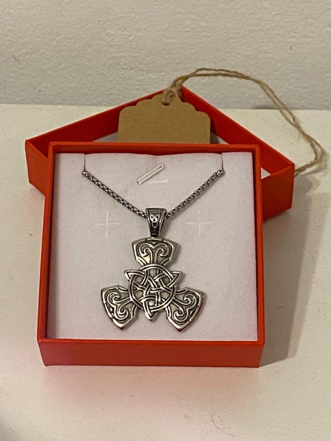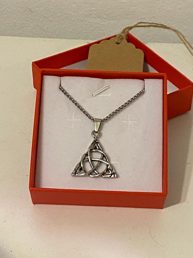 Colgante estilo celta "triqueta", un símbolo clásico asociado a unión y eternidad. Dije calado en tono plata.