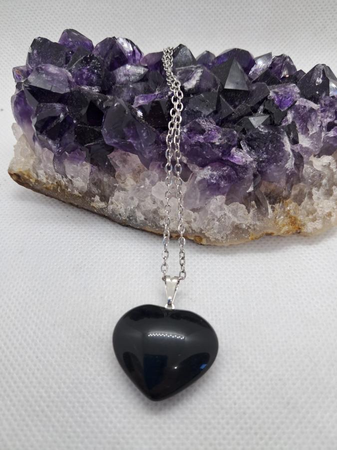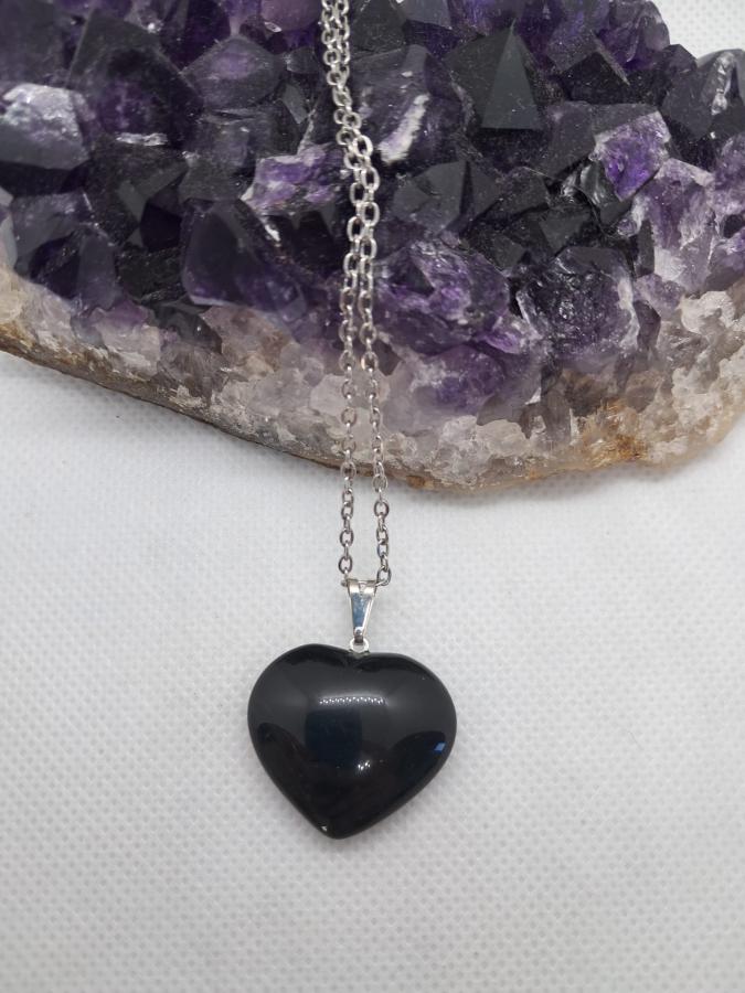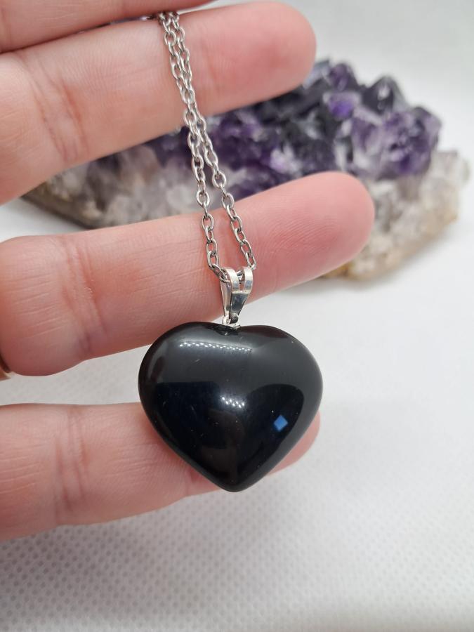 Dije en forma de corazón en piedra natural obsidiana con cadena fina de acero.