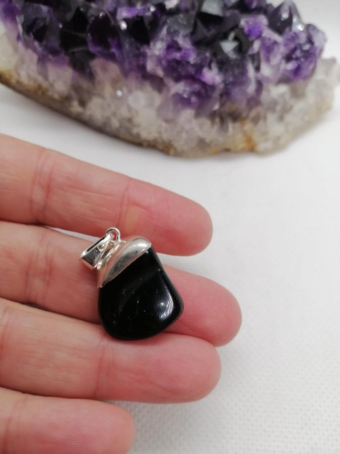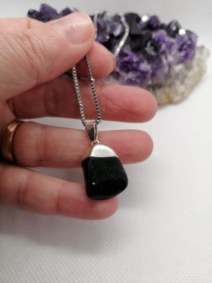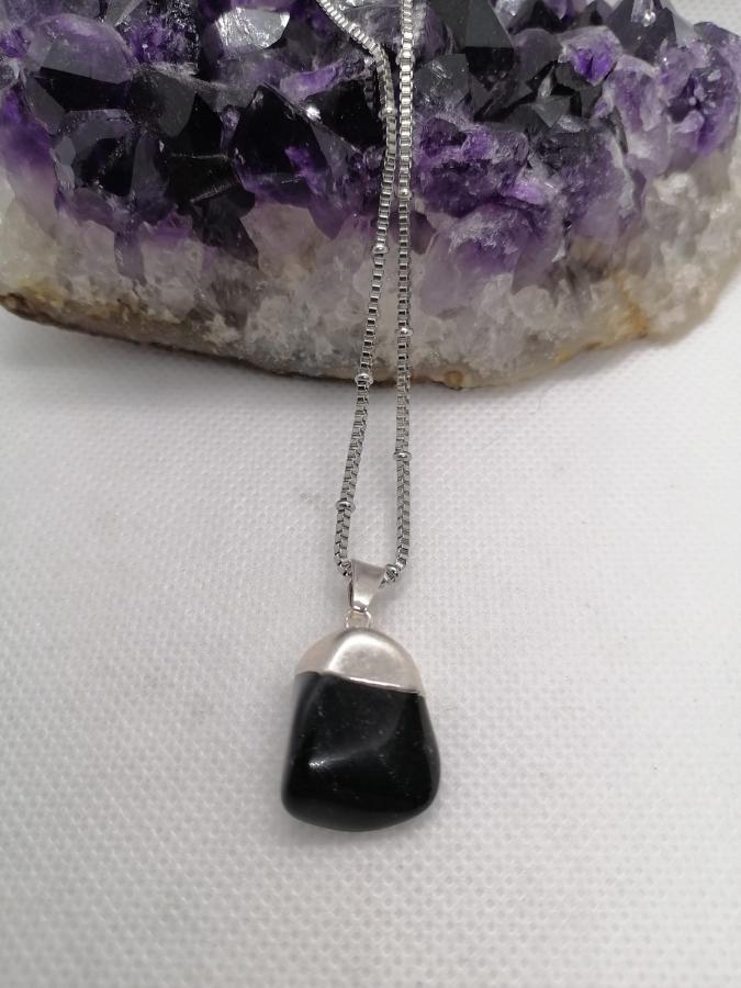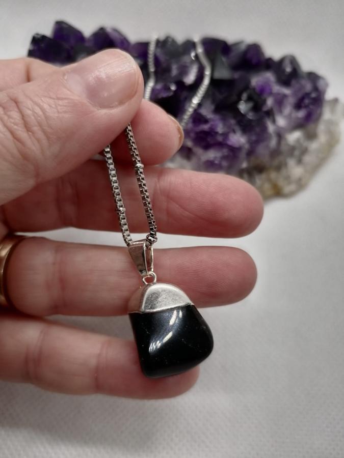 Dije en piedra natural obsidiana con cadena gruesa de acero.