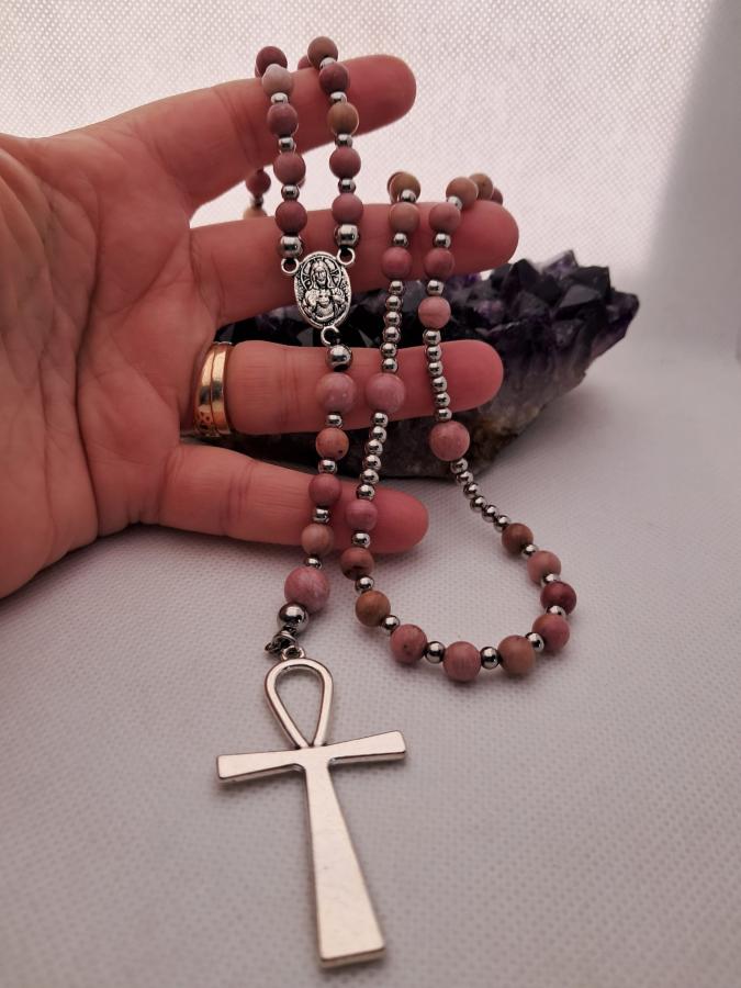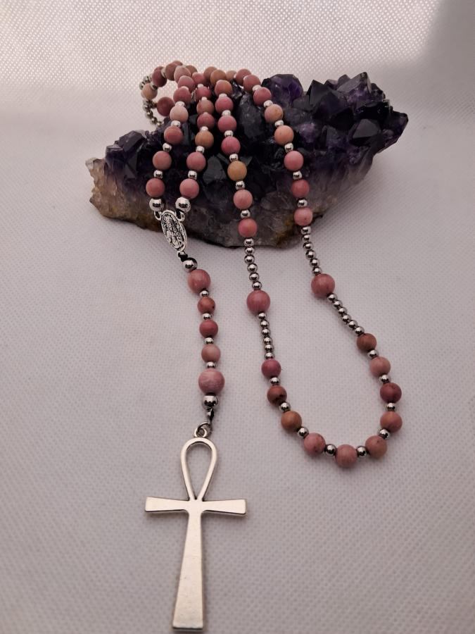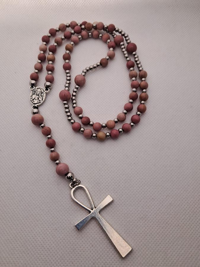 Collar rosario en piedra natural rodonita con bolita 6mm y 8mm