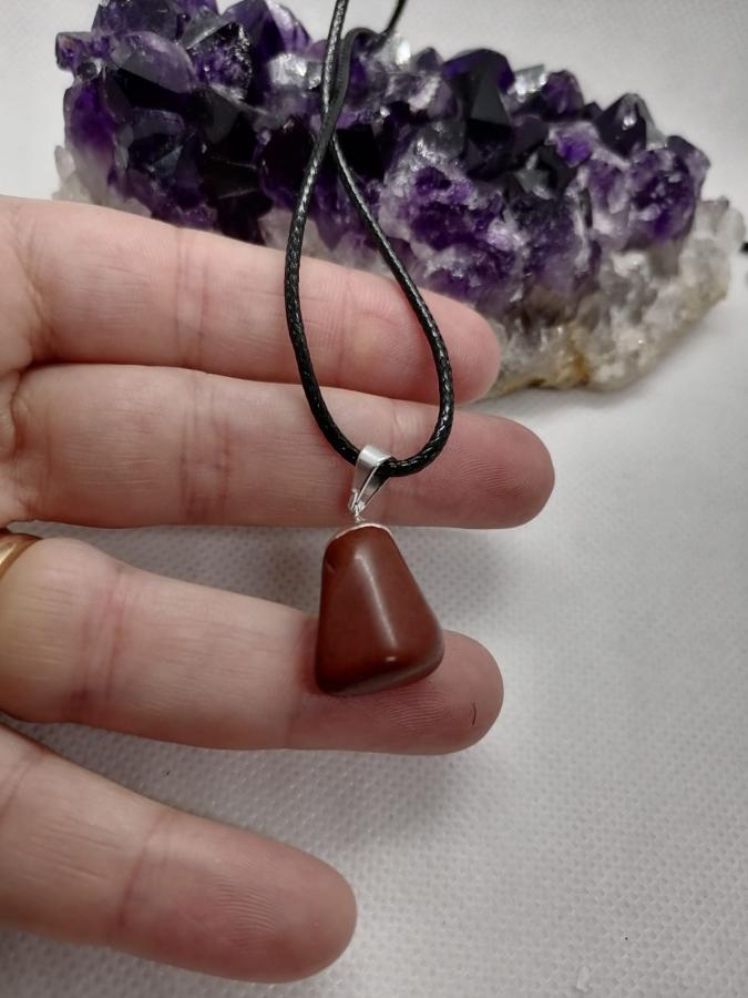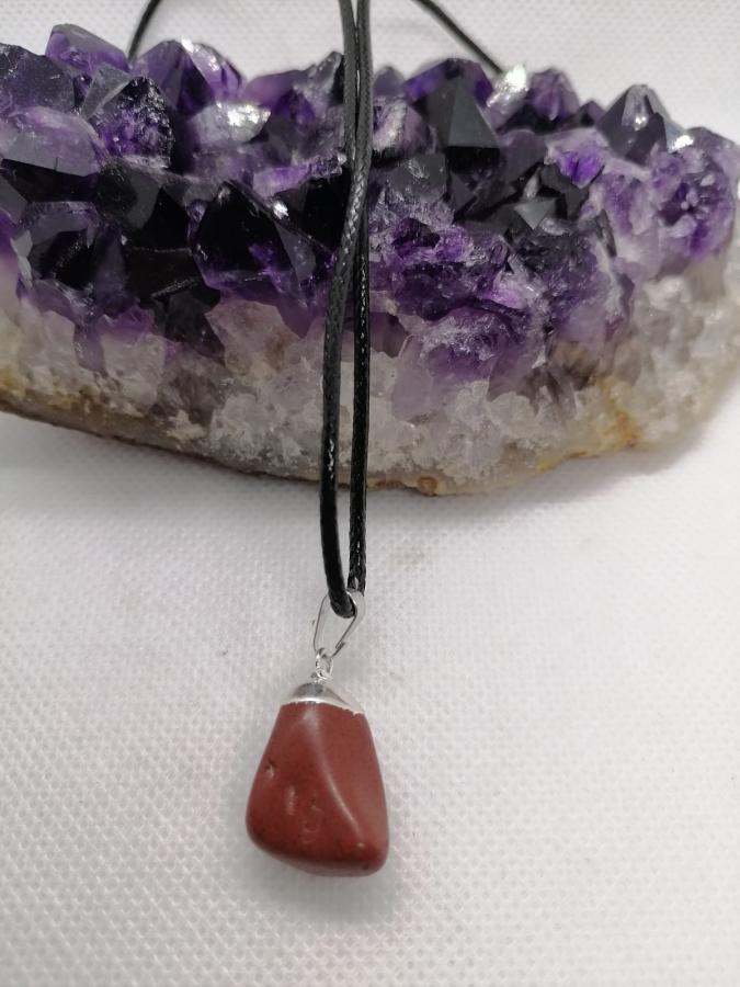 Dije con electro en piedra natural jaspe rojo con cordón negro.