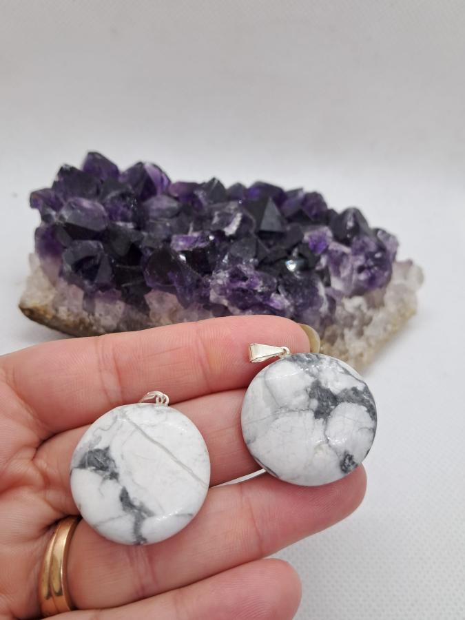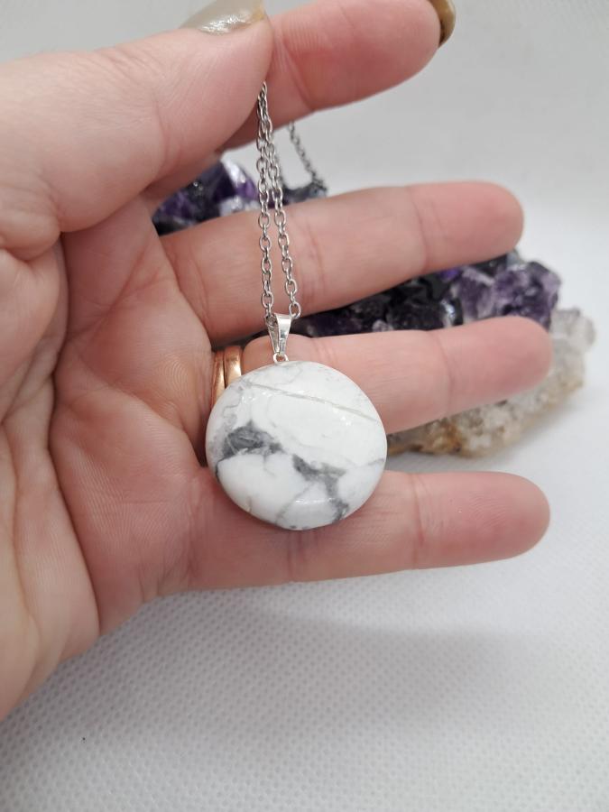Dije medalla piedra natural Howlita con cadena fina de acero.