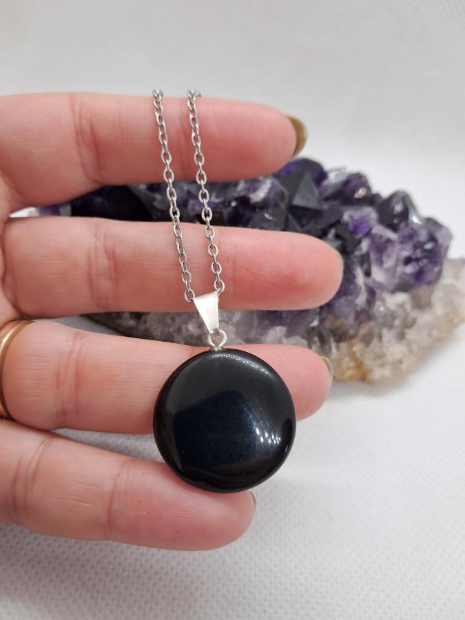 Dije Medalla en piedra natural obsidiana con cadena fina de acero.