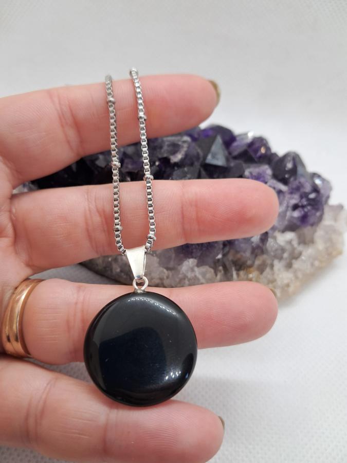 Dije Medalla en piedra natural obsidiana con cadena gruesa de acero.