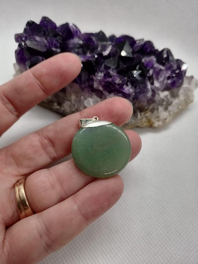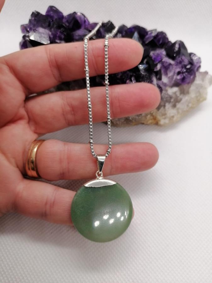Dije medalla con electro en piedra natural cuarzo verde con cadena gruesa de acero.