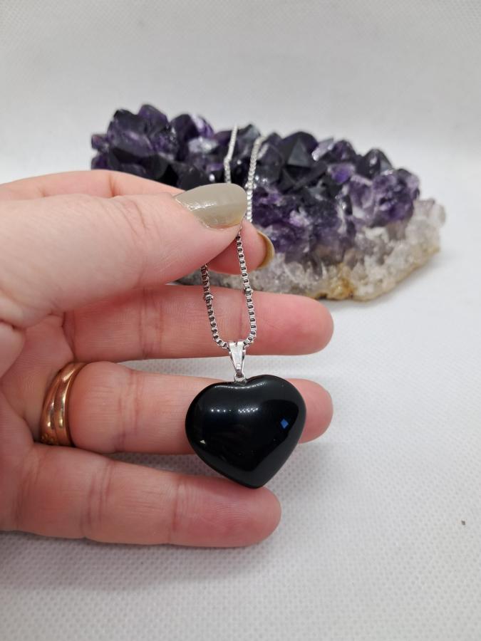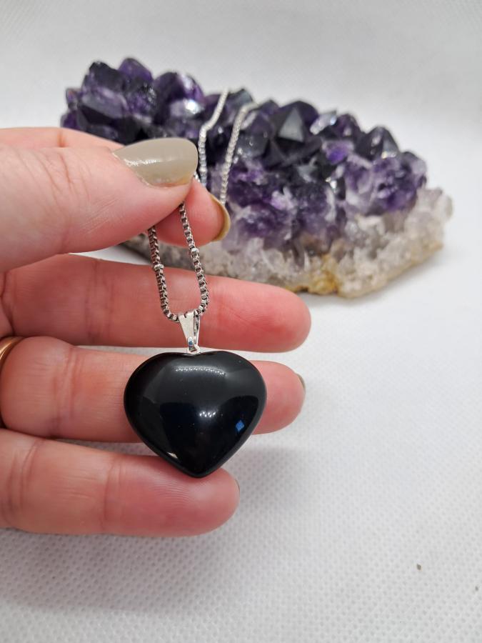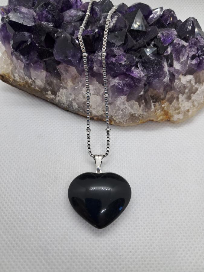 Dije en forma de corazón en piedra natural obsidiana con cadena de acero.