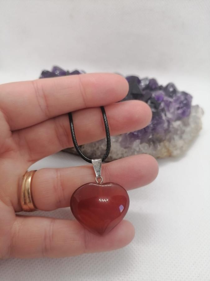 Dije corazón en piedra natural cornalina con cordón negro.