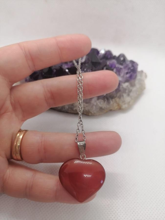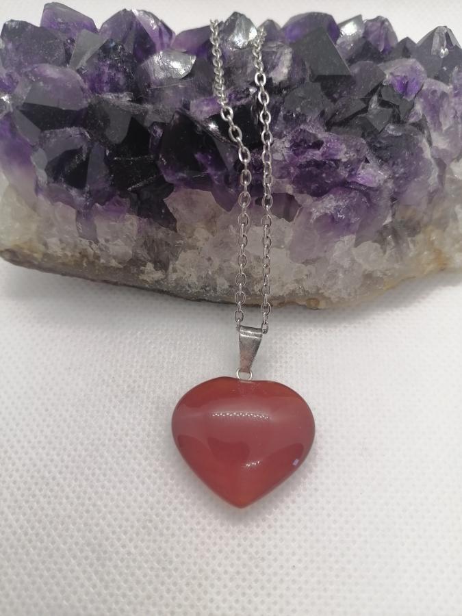 Dije corazón en piedra natural cornalina con cadena fina de acero.
