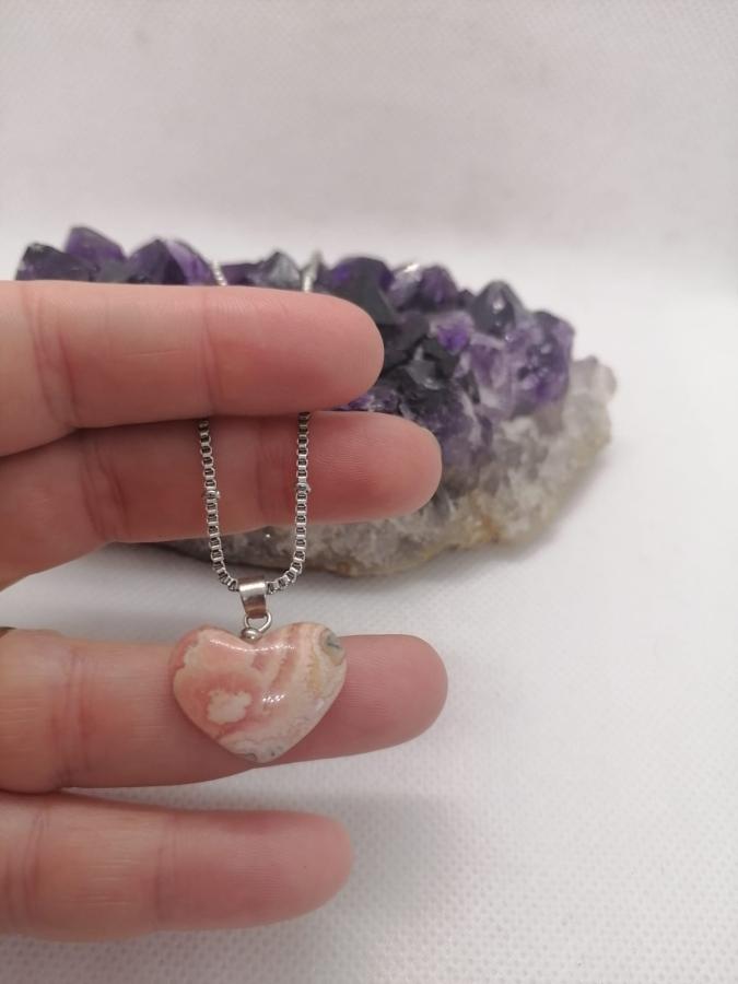 Dije corazón en piedra natural rodocrosita con cadena gruesa de acero quirúrgico.