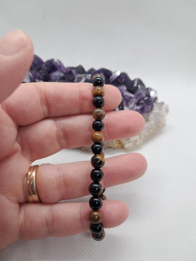 Pulsera doble protección de obsidiana y ojo de tigre en bolita de 6mm elástica.