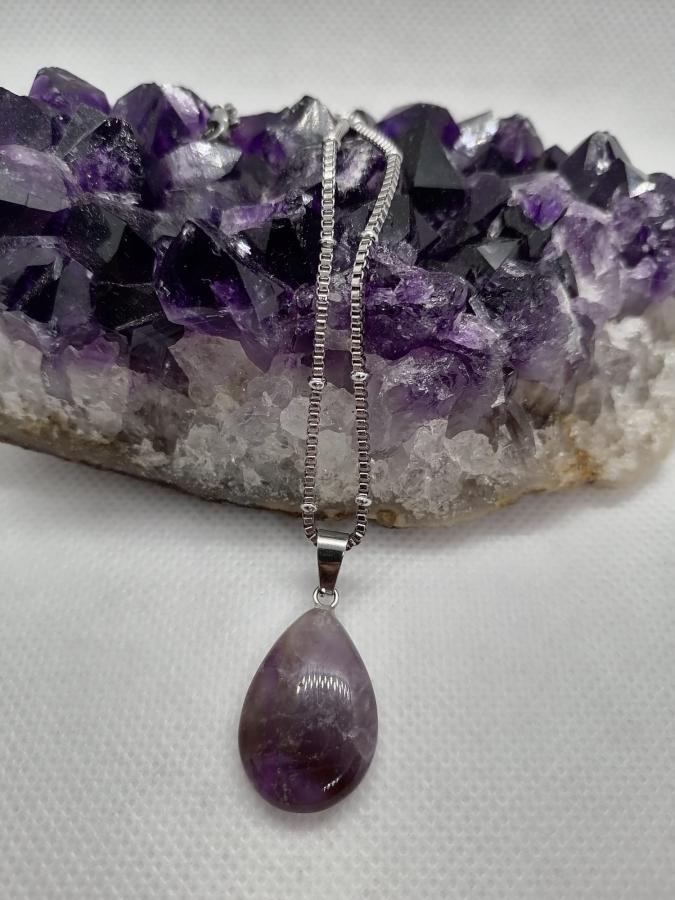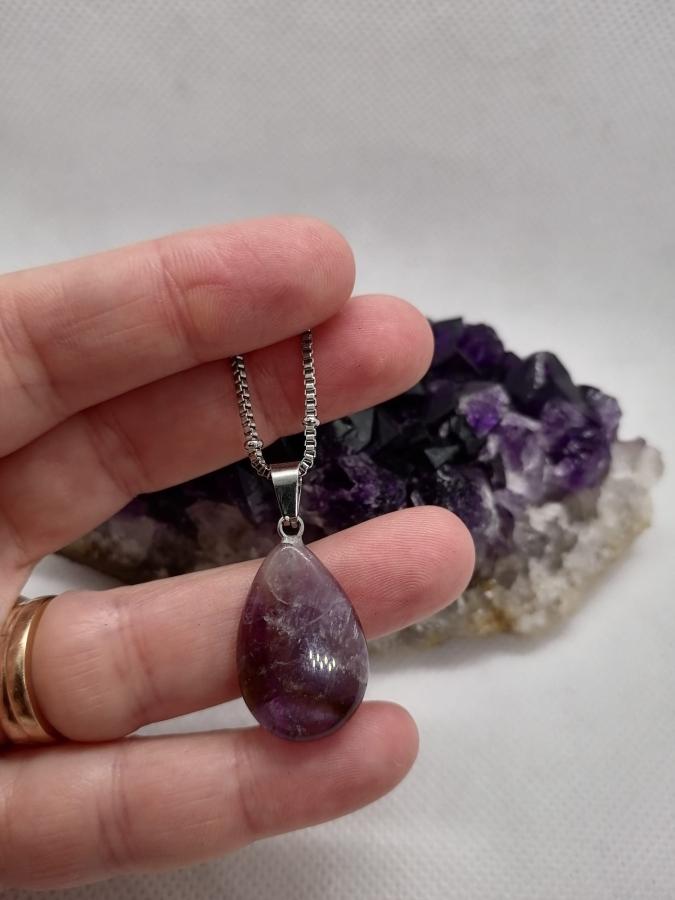 Dije gota en piedra natural amatista con cadena fina en acero.