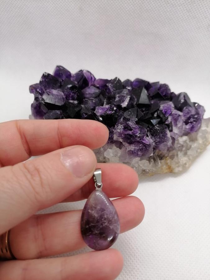 Es ideal para aliviar dolores de cabeza o migraña, para tratar problemas pulmonares o respiratorios y para problemas de la piel. Combate el insomnio y aporta un sueño reparador colocándola debajo de la almohada. Limpia el aura y transmuta le energía negativa, además de estimular los chakras de la garganta y coronilla.Inspira tranquilidad y relaja las emociones. Ayuda en situaciones de pérdida de un familiar.Los efectos relajantes de la amatista ayudan en la eliminación del estrés emocional y en los estados de menopausia. Crea armonía y tranquiliza en los momentos de ansiedad e irritabilidad.