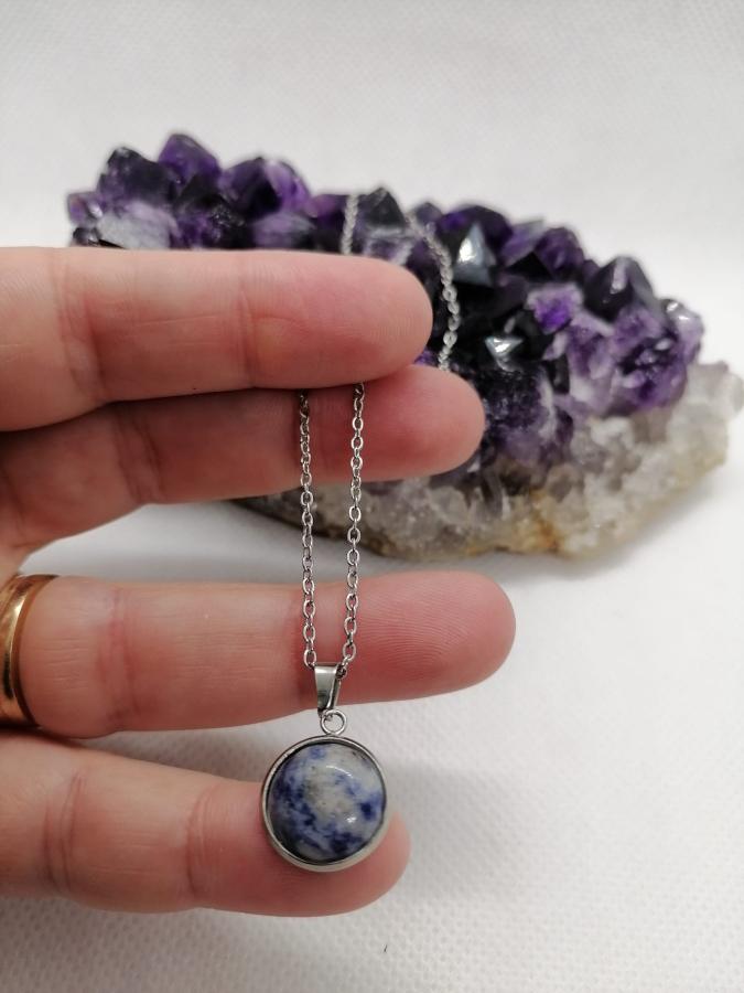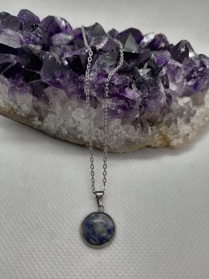 Dije en piedra natural cuarzo azul con cadena fina de acero.