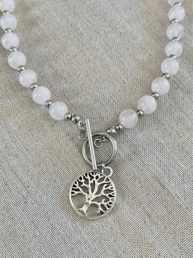 Collar gargantilla en Cuarzo rosa bolita de 8mm y cierre y separadores de acero.