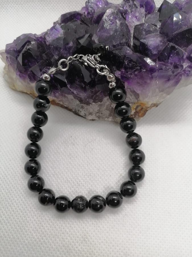 Pulsera en turmalina negra bolita de 8 mm con cierre de acero.