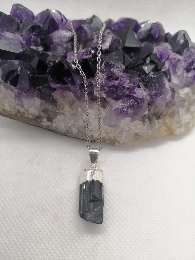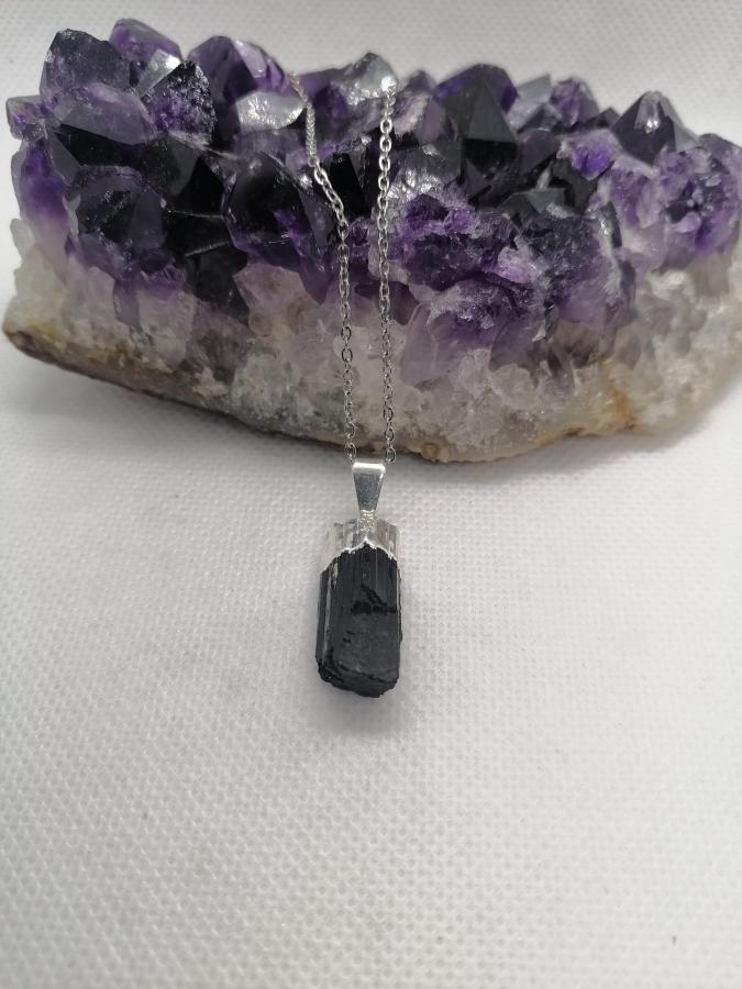 Dije con electro en piedra natural turmalina negra con cadena fina de acero.