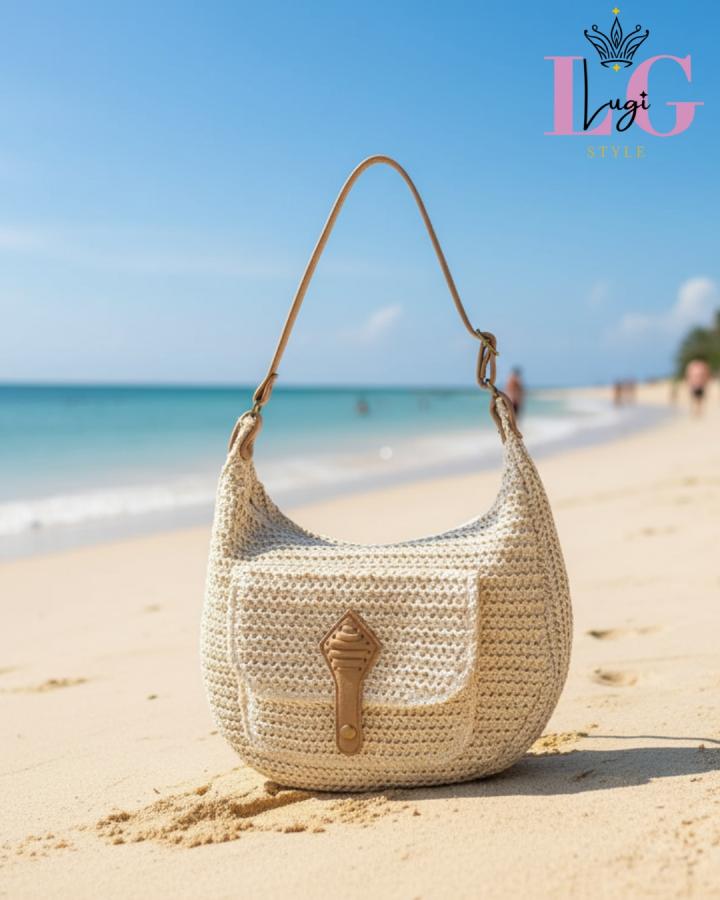 Tejido en paja beige, combina textura, ligereza y estilo, creando un accesorio ideal para tus días de verano o tus looks urbanos más relajados.